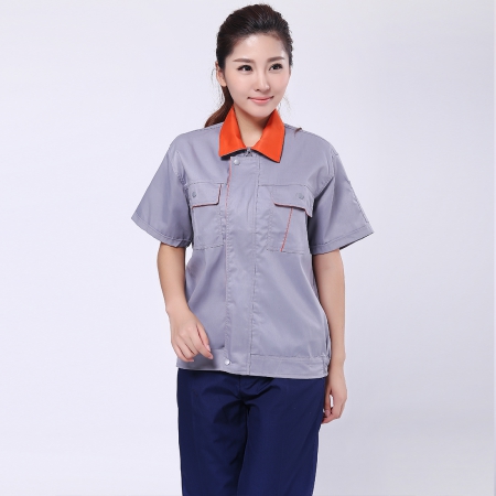 苏州鹰诺服装:深银灰拼橘黄短袖工作服AD056-DX