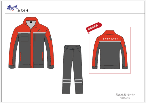 开源矿业是需要到井下去工作的,所以工作服要有多处反光条的设计,在黑暗井下能够反光,加强防护作用。同时主色是深灰色,能够起到耐脏作用。在裤腿也加了两圈反光条,除了左胸刺绣的标志,后背还印刷上了:您的信任,我的责任。胸前口袋采用不对称的设计,打破原始工作服的呆板。